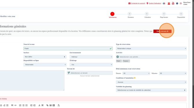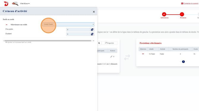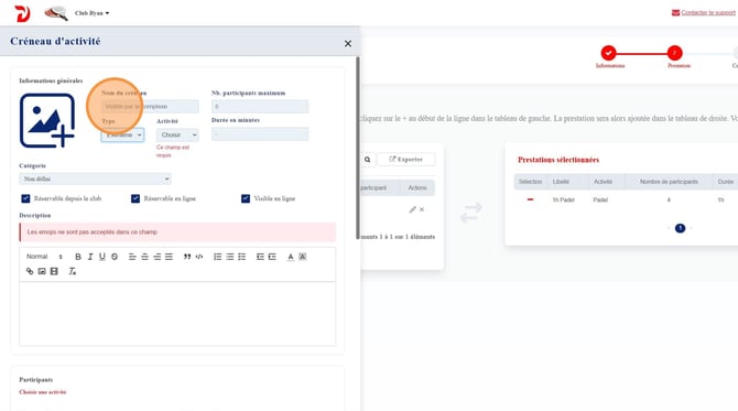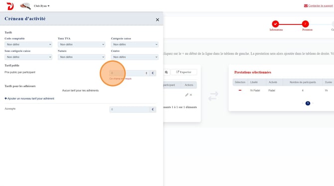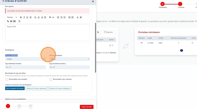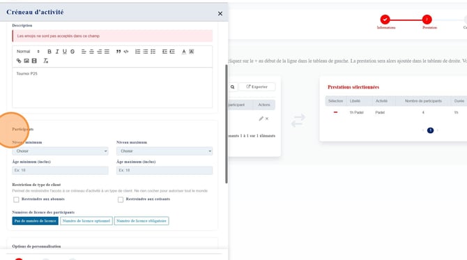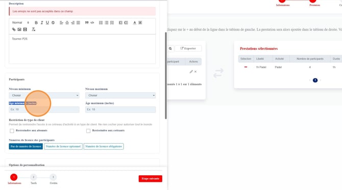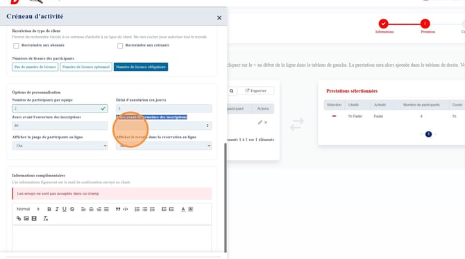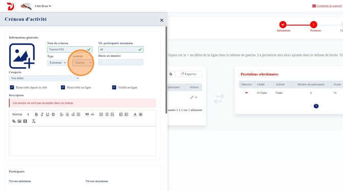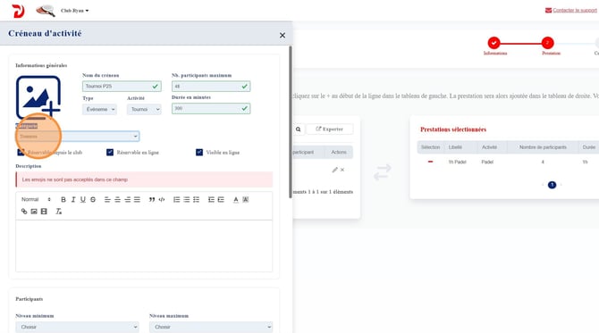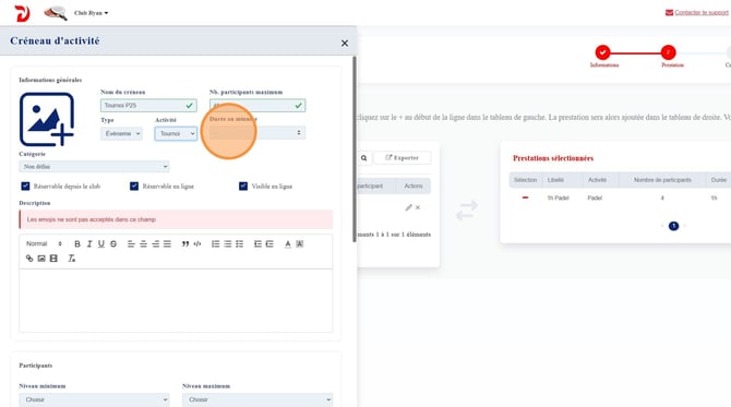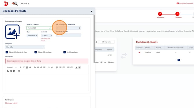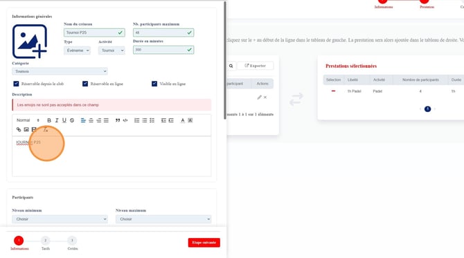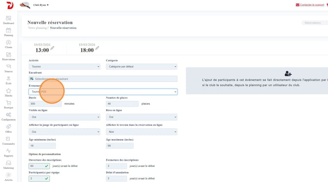 Dans le champ Nom du créneau, saisissez le nom du tournoi (ex : Tournoi P25).