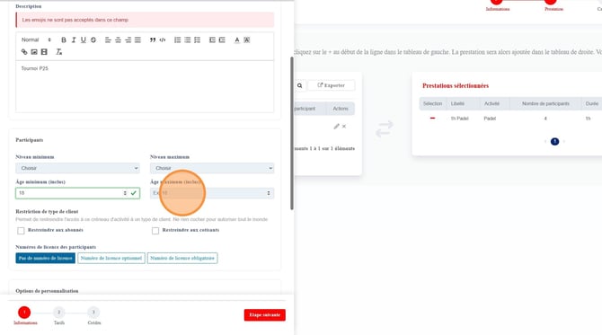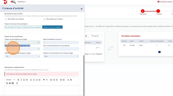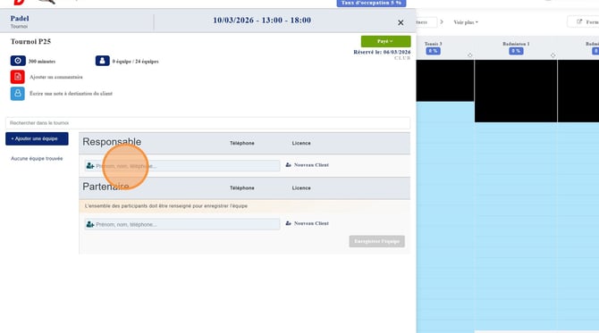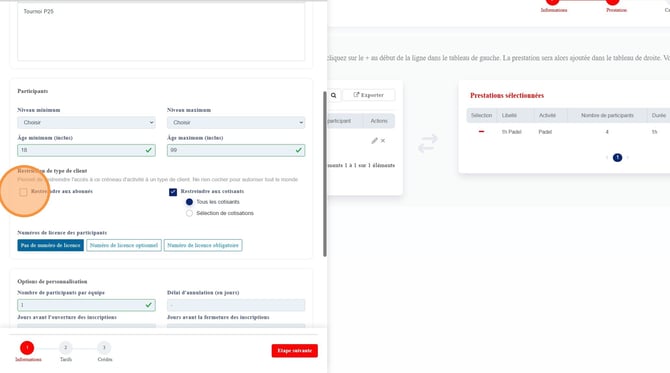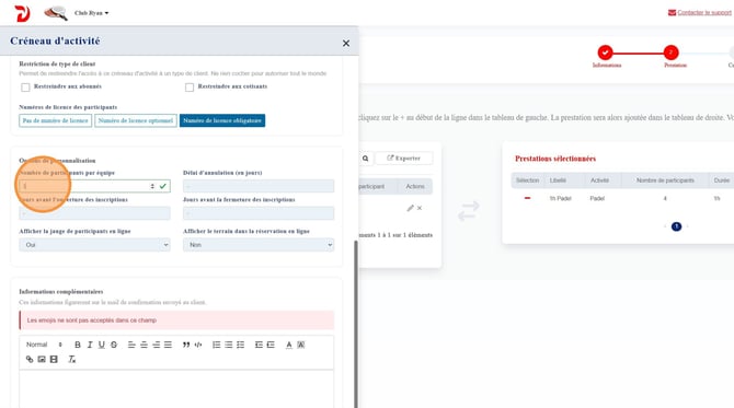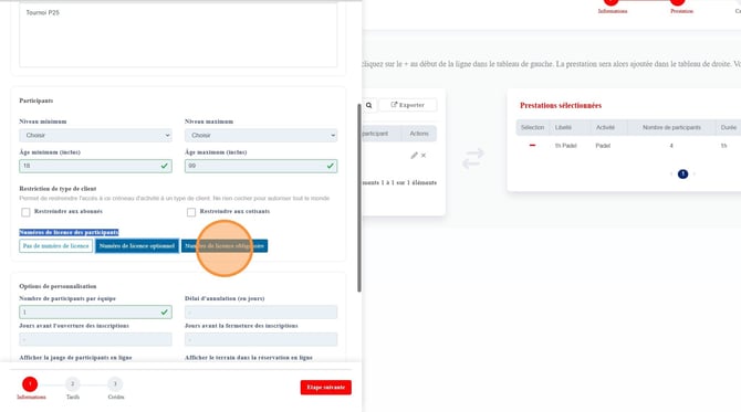 Dans Nombre de participants par équipe, indiquez le nombre de joueurs (ex : 2 joueurs par équipe pour un tournoi de padel).