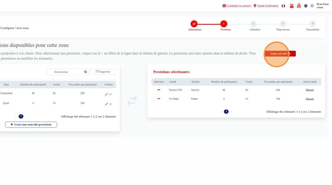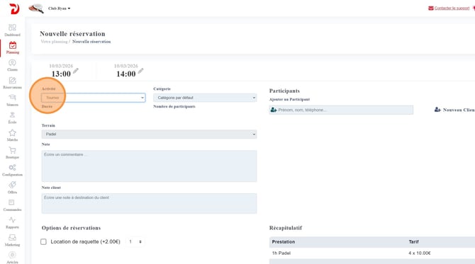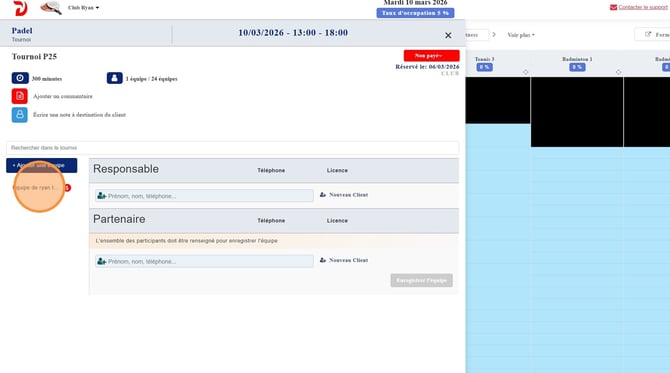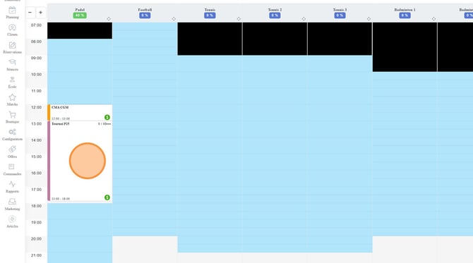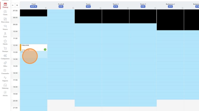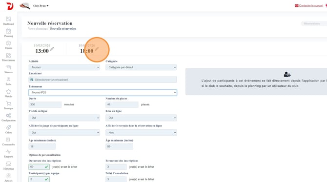 Sélectionnez la date et l’horaire de début du tournoi ex : 13:00 – 18:00) puis cliquez sur le créneau souhaité.